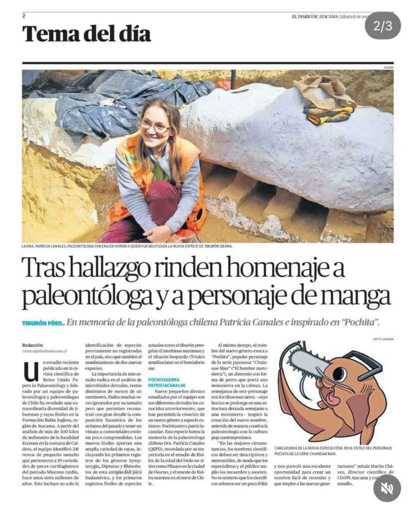 Στη Βόρεια Χιλή, στην περιοχή Ατακάμα, ανακαλύφθηκε ένα νέο είδος απολιθωμένου καρχαρία-πριόνι, ο οποίος πήρε το όνομα Pochitaserra patriciacanalae. Ναι, σωστά διαβάσατε, Pochita από το δημοφιλές manga και anime Chainsaw Man.